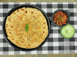 Roll out another dough and put filling/stuffing in the center, place another round dough on top, seal edges and roll out carefully with the help of rolling pin.