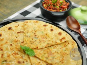 Heat griddle and place rolled paratha on it, fry from both sides with ghee.