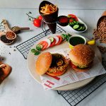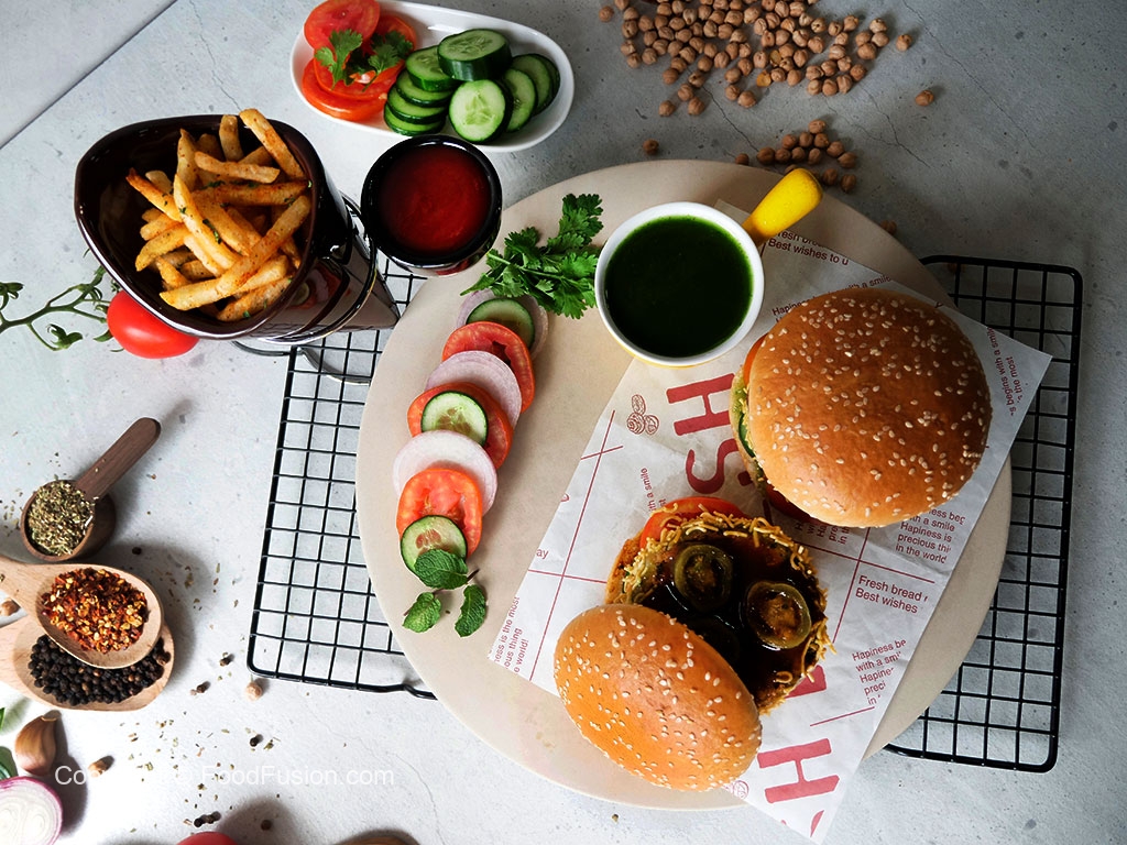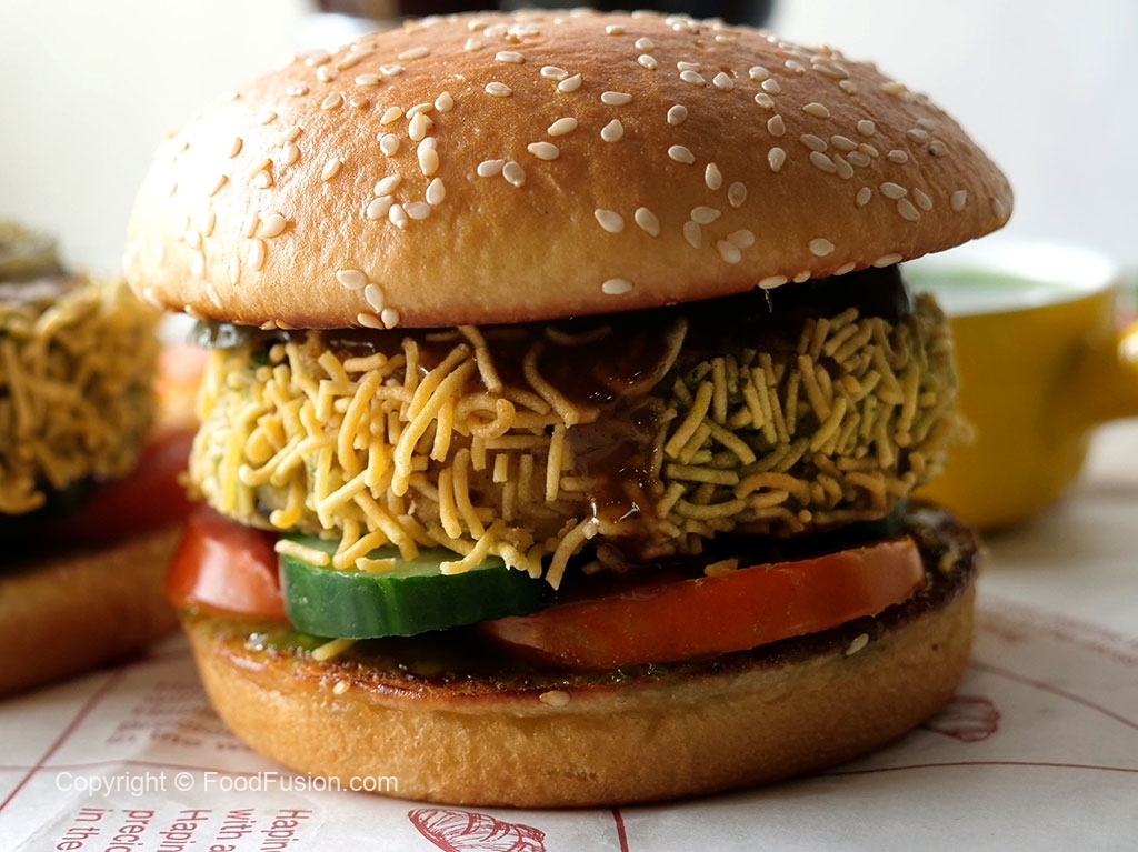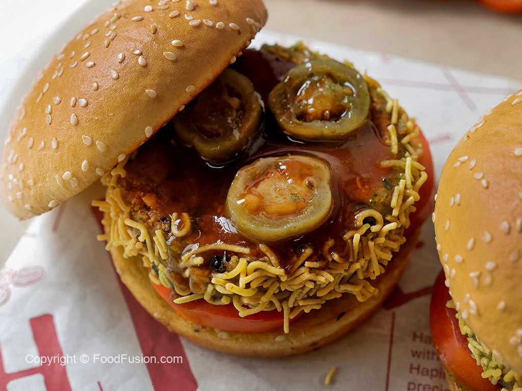 On a burger bun,add & spread green chilli sauce,add tomato,cucumber,fried patty,jalapeno slices & drizzle tamarind sauce.