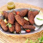 -Take small quantity of chapli kabab mixture & flatten it on your palm,place stuffed green chilli in the center & coat evenly.