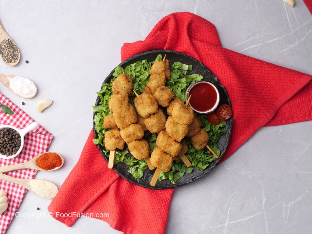 -In a wok,heat cooking oil & fry chicken skewers on low flame until golden brown (makes 8).