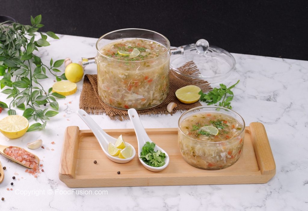 -Serving bowl mein lemon juice,tayyar soup,kali mirch crushed,hara dhania,lemon slice dal dein & garam serve karein!