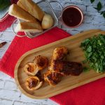 Add 2 tbs of prepared pizza filling & roll the fillet then insert mini skewers to seal sides properly.