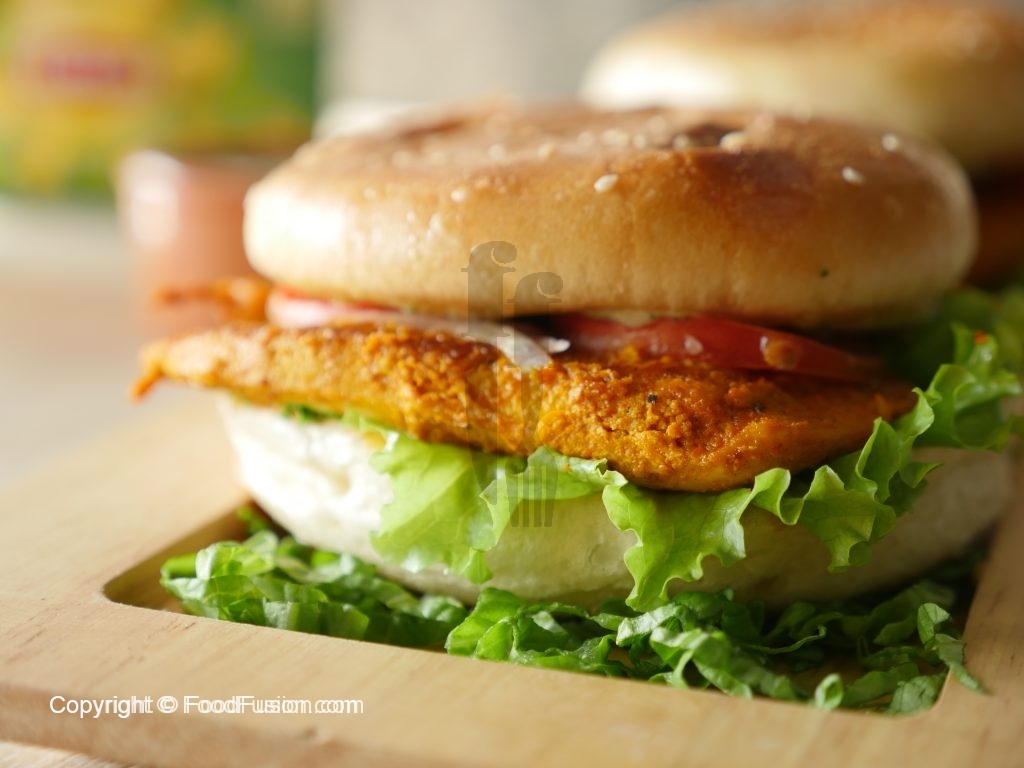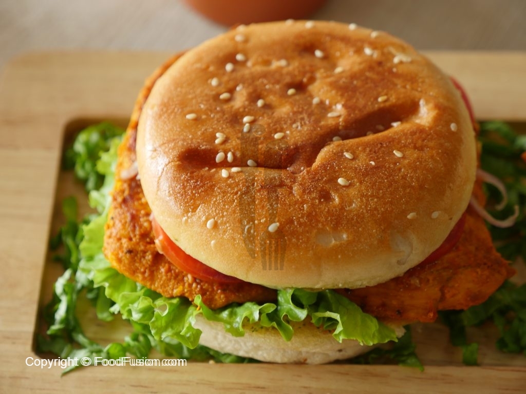 On burger bun,add chutney,salad leaf,grilled chicken fillets,onion,tomato ketchup and tomato slices.