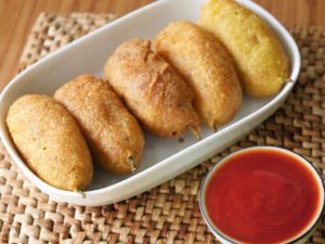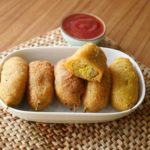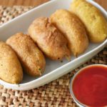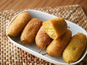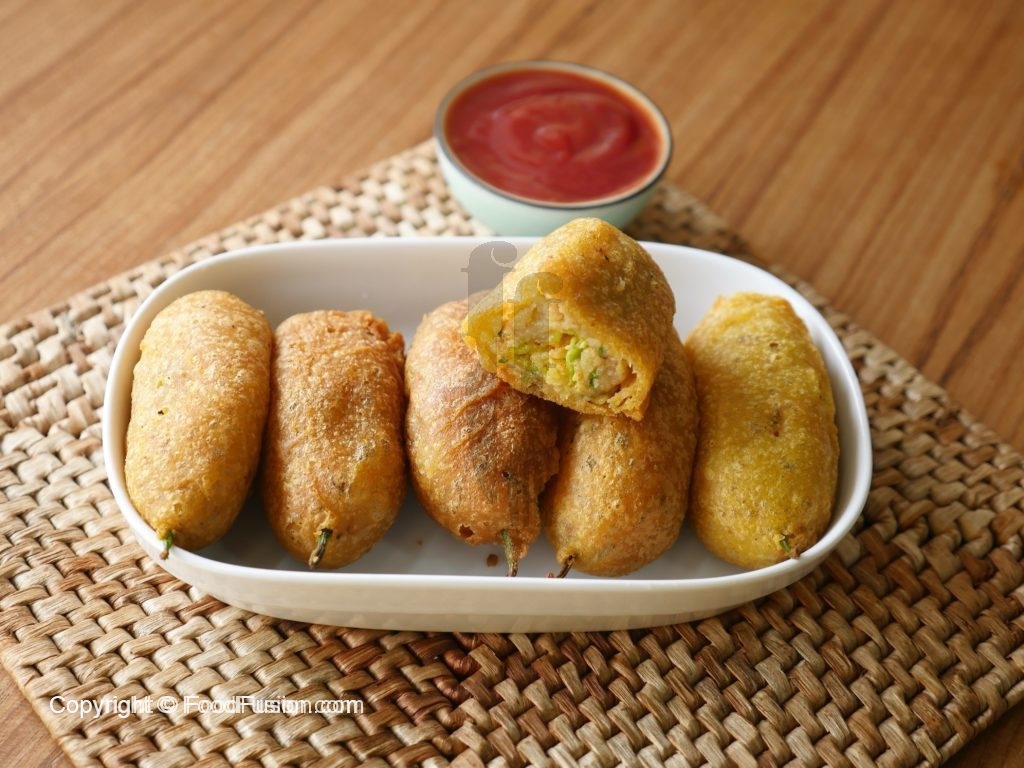 In green chilies,add masala mix or mozzarella cheese with masala mix,coat with potato coating then dip into pakora batter.