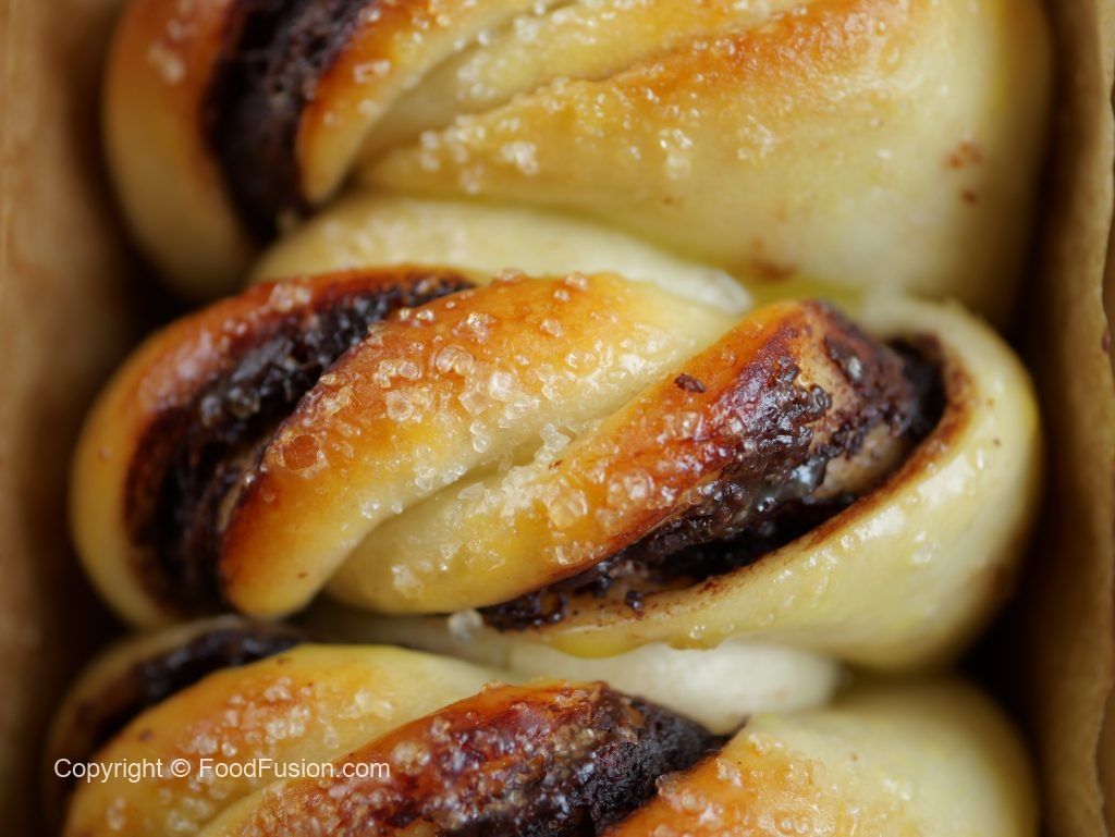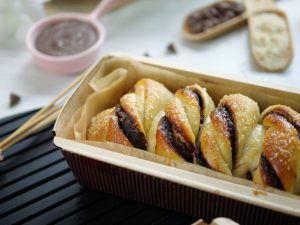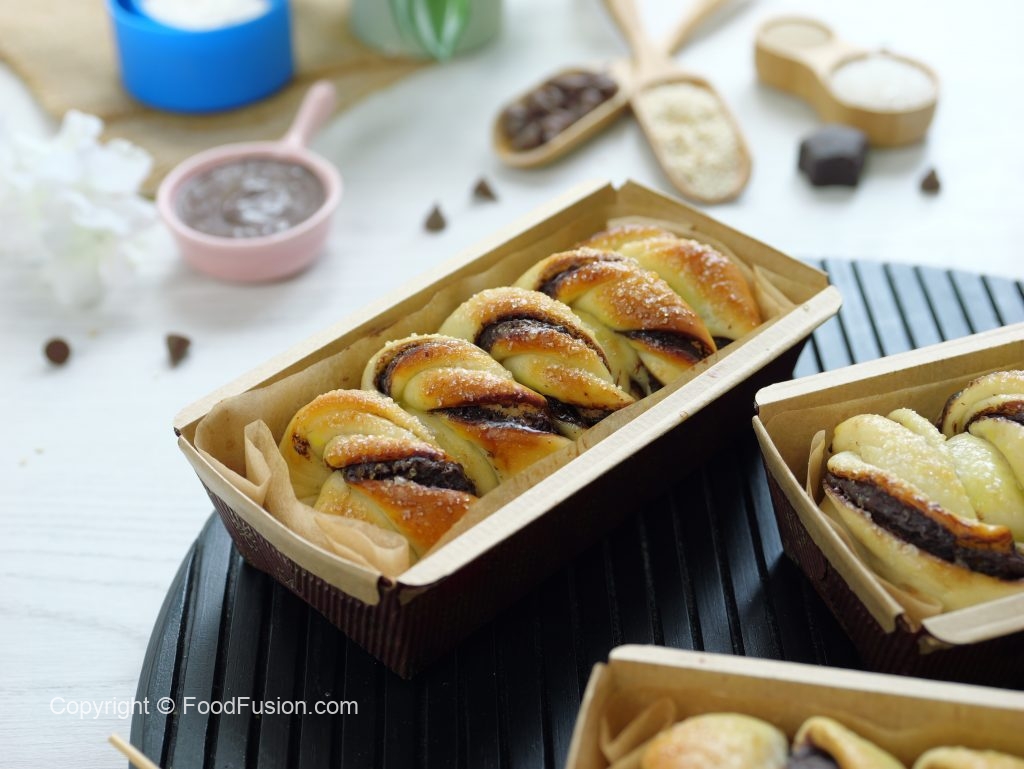 -Spread chocolate spread on rolled dough & flip one end over the other.