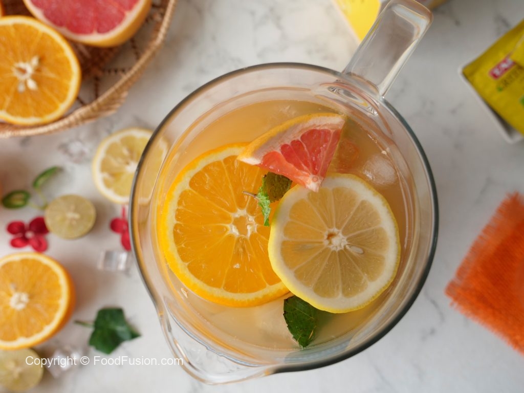 Jug mein ice cubes,lemon slices,orange slices,grape fruit slices,tayyar lemon green tea,grape fruit juice,orange juice,lemon juice aur podina dal ker stir ker lein & serve karein!