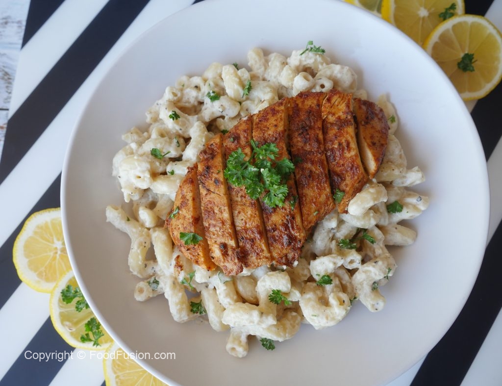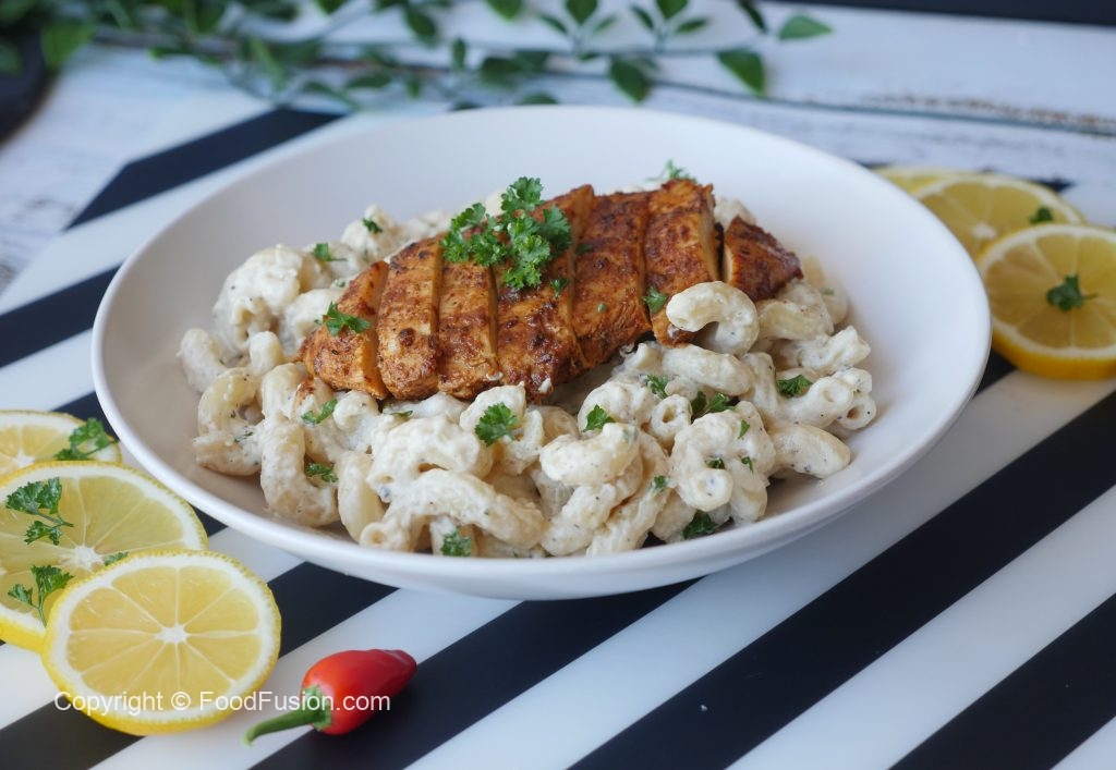 Serving plate mein pasta dal ker grilled chicken rakh dein aur fresh parsley sa garnish ker ka serve karein!