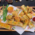 -Take spring roll sheet,add prepared crispy beef & veg filling,fold over the sides,roll up & apply all-purpose flour slurry.