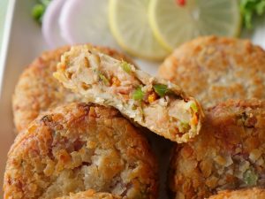 Grease hands with oil,taka a mixture and make cutlets of equal sizes then dip into all-purpose flour paste and coat in crumbled samosa/manda patti (makes 16-18).