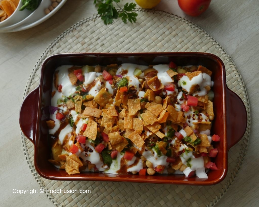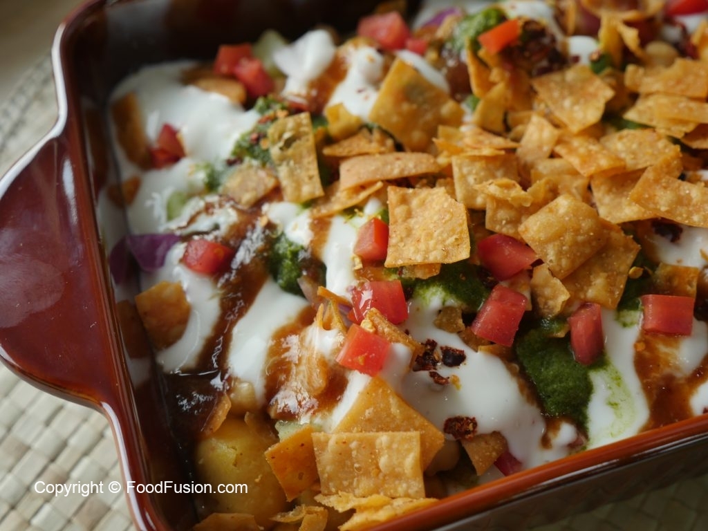 In serving dish,add yogurt,phulkiyan,red chilli crushed,chaat masala,potato,chickpeas,tomato,onion, meethi chutney,green chutney,papri,yogurt,meethi chutney,green chutney,red chilli crushed,tomato, papri & serve!