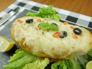 In bowl,add shredded chicken,pizza cheese,colored bell peppers,onion,red chili crushed and oregano, mix well and set aside.