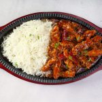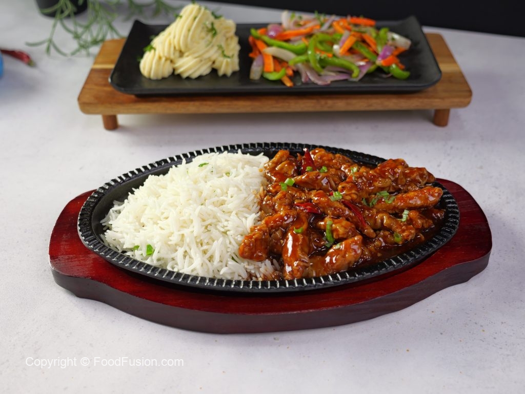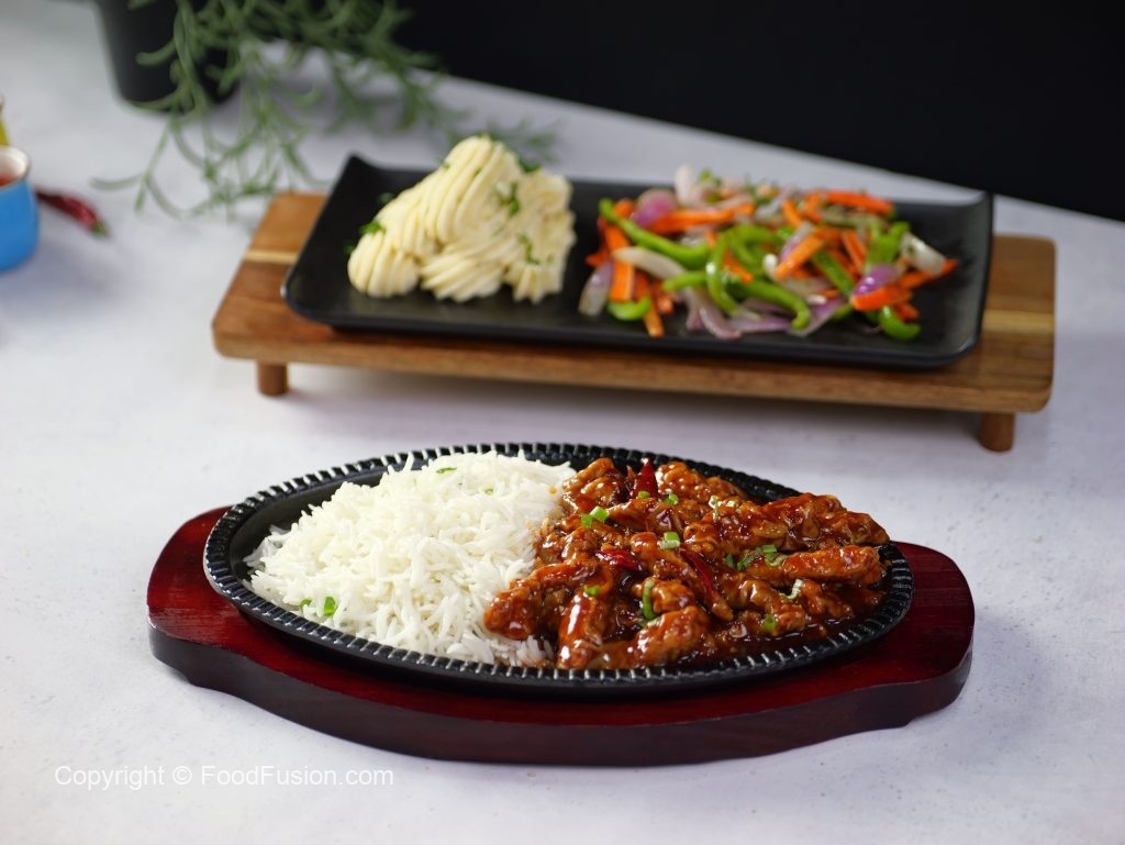 -Grease hot sizzling plate with butter,add rice,hot garlic chicken & serve with mash potatoes & sauteed vegetables!