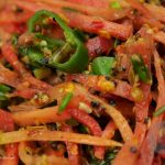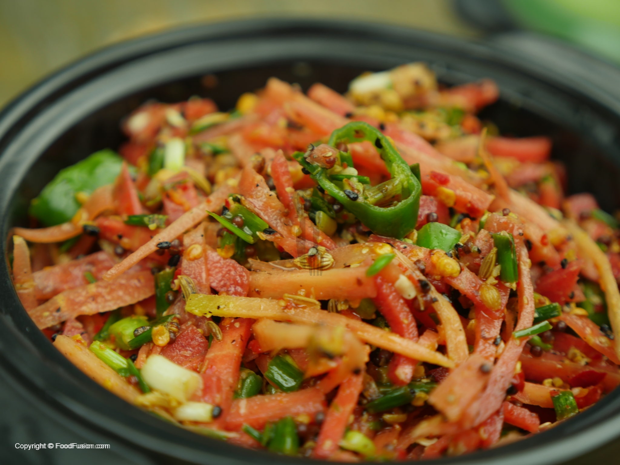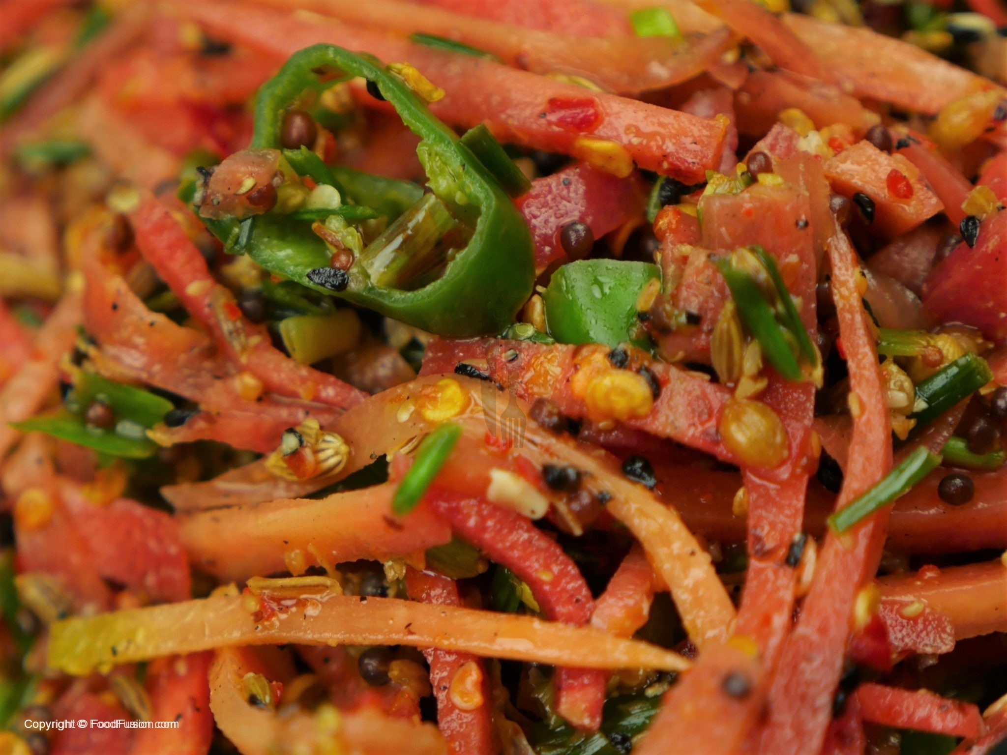 In bowl,add oil,nigella seeds(crushed),mustard seeds (crushed),coriander seeds(crushed),salt,red chili flakes,fennel seeds (crushed),tarti,garlic paste,green garlic,green chili and carrots.