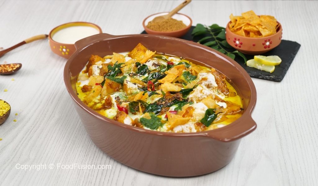 -Serving dish mein phulkiyan,tayyar dahi mixture,tayyar khattay aloo,dahi mixture,green chutney,tayyar tarka aur papri dal ker serve karein!