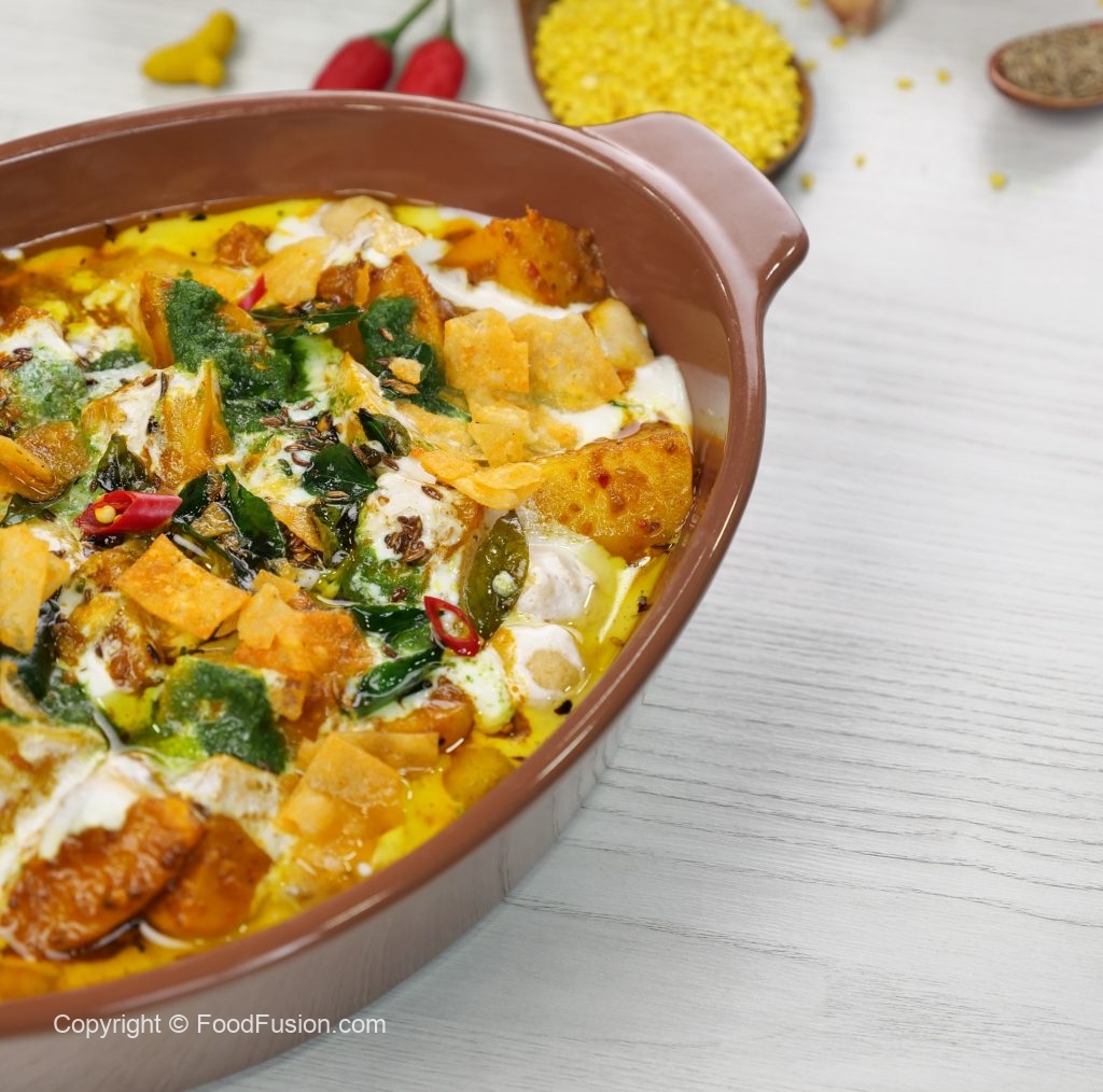 -In a serving dish,add phulkiyan,prepared dahi mixture,prepared khattay aloo,dahi mixture,green chutney,prepared tarka,papri & serve!