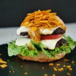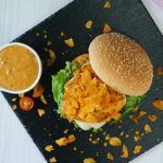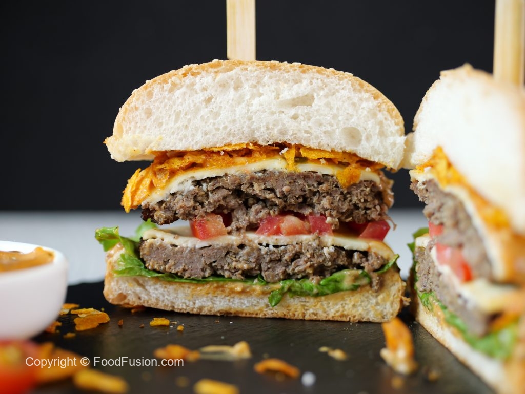 -On a burger bun,add & spread prepared fusion burger sauce,add salad leaves,burger patty with cheese, tomato slice,burger patty with cheese,fusion burger sauce,spicy chips (coarsely crush with hands) & serve with french fries (makes 3 burgers).