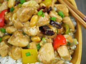 In a wok, add oil and saute dried red chilies, ginger, garlic. Add white part of green onion and bell pepper, saute and add chicken and sauce.