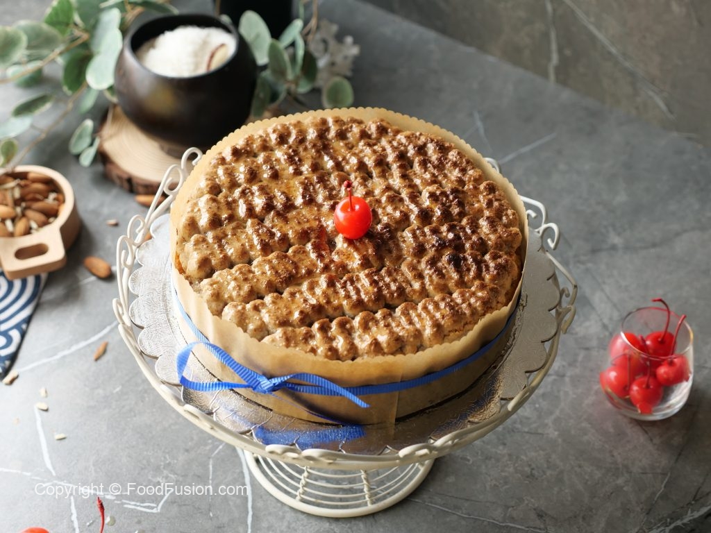 -Spread a layer of prepared macaroon topping then make a line of wavy design and bake again in preheated oven at 130C for 20-22 minutes (turn on top grill only).