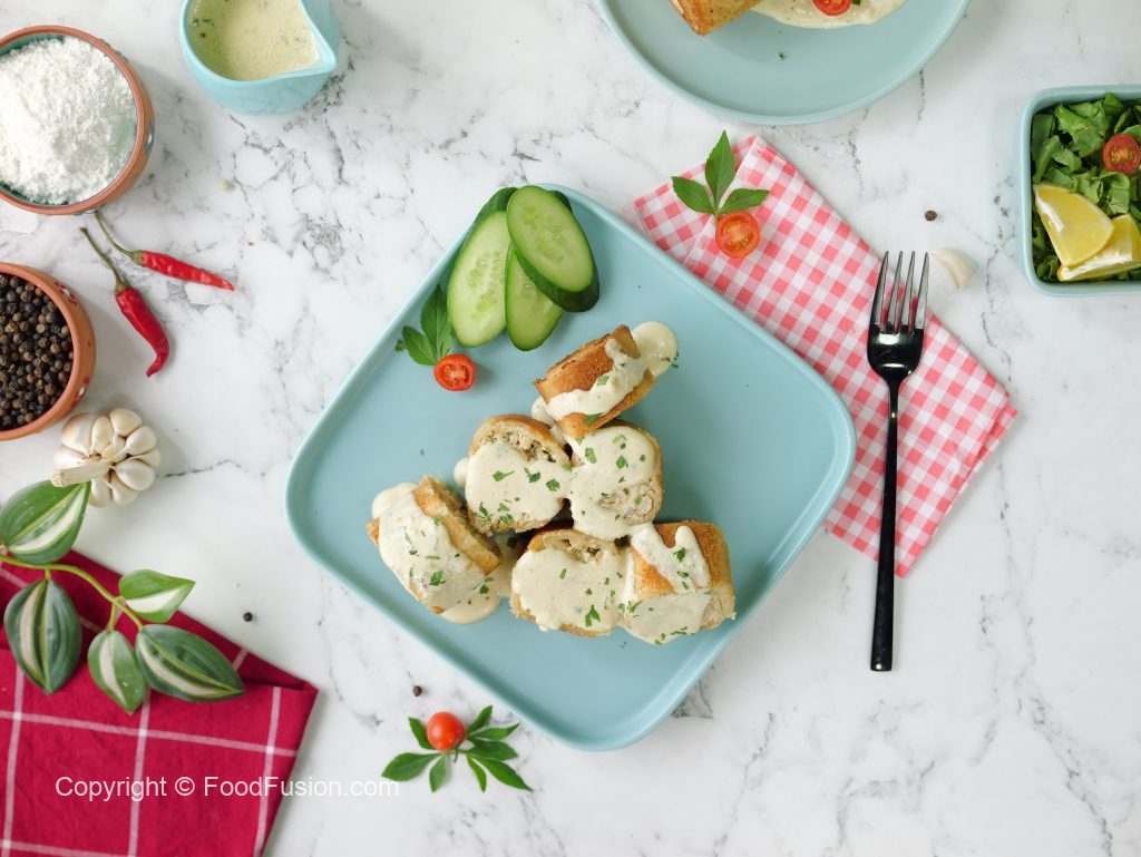 -Cut prepared malai chicken roll ups & drizzle prepared creamy sauce,sprinkle fresh coriander & serve (makes 4-5).