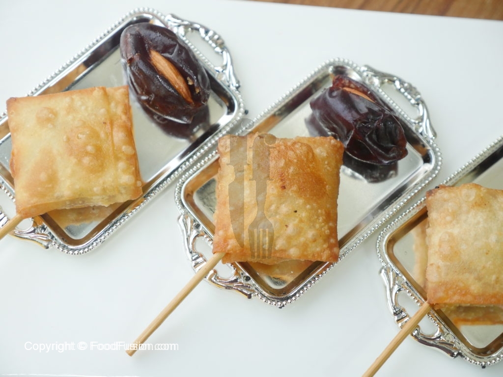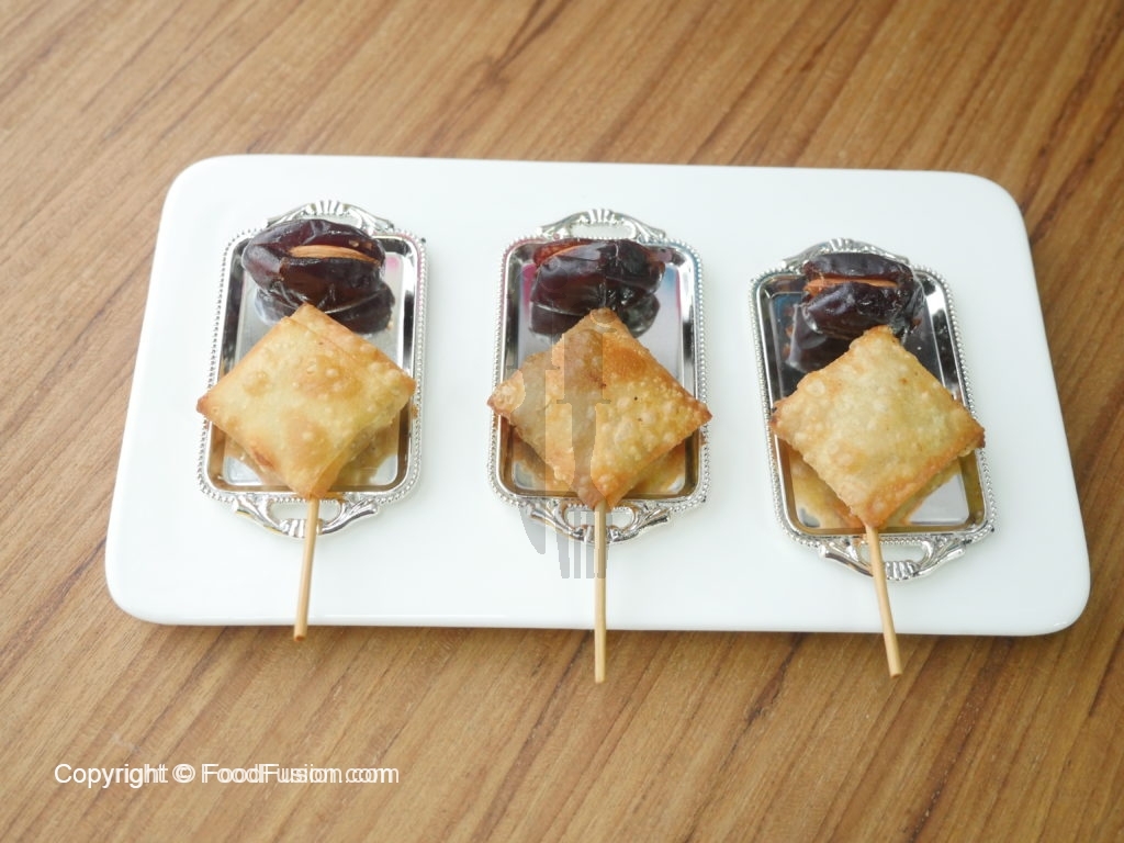 Take samosa sheet and cut into four equal parts/strips,place one samosa patti/strip horizontally,apply all-purpose flour paste,place skewer/stick then place second samosa patti vertically over first one,it will make plus (+) sign.