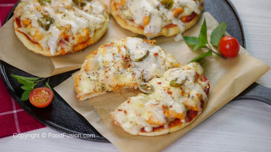 -Chulha bund ker dein,cooked naan per pizza sauce dal ker pheela lein,cooked chicken,tayyar alfredo sauce,cheddar cheese,mozzarella cheese,pickled jalapenos,lal mirch crushed & dried oregano dal ker dhak dein,chulha on karein aur halki ancch per cheese melt ho janay tak paka lein (3-4 minutes).