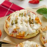 -Turn off the flame,on cooked naan,add & spread pizza sauce,add cooked chicken,prepared alfredo sauce,cheddar cheese,mozzarella cheese,pickled jalapenos,sprinkle red chilli crushed & dried oregano,cover,turn on the flame & cook on low flame until cheese melts (3-4 minutes).