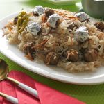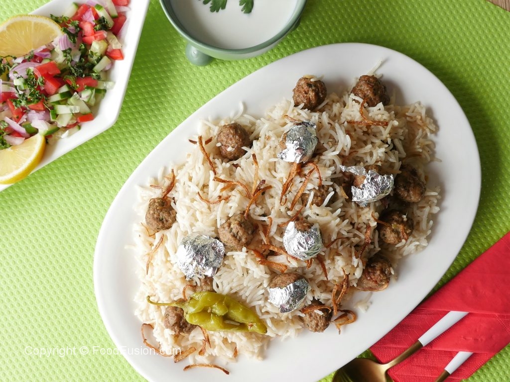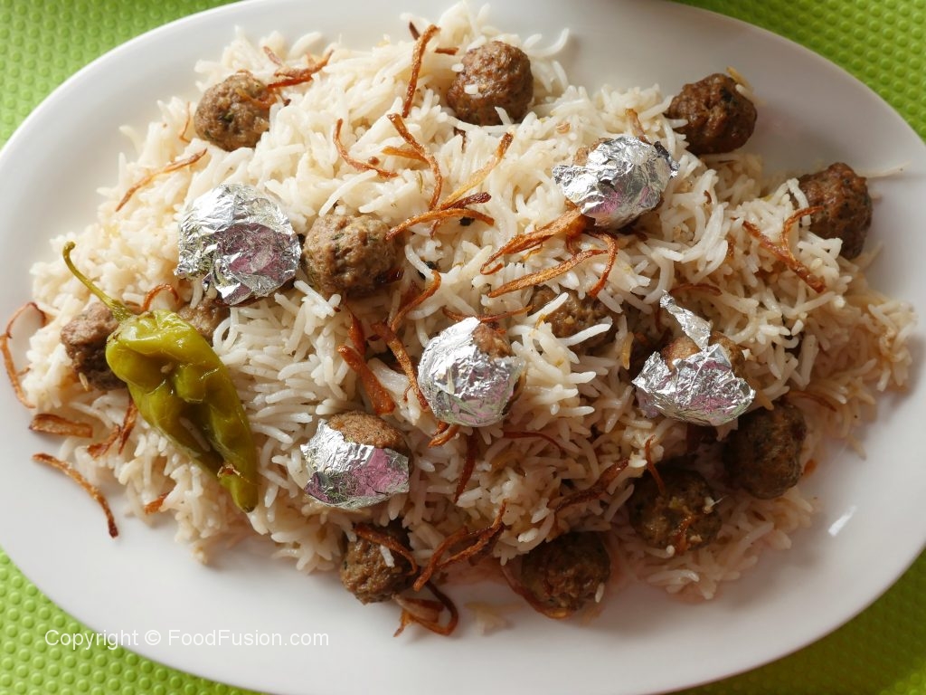 On serving plate,add cooked rice,fried onion,fried meat balls & serve.