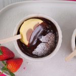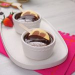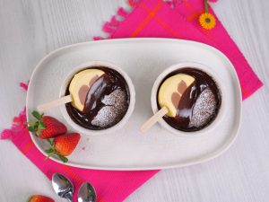 -Pour prepared batter in ramekins & add 1 tbs of prepared chocolate ganache inside the batter,cover with cling film & can be stored in freezer for up to 1 month,just thaw for 10 minutes before baking.