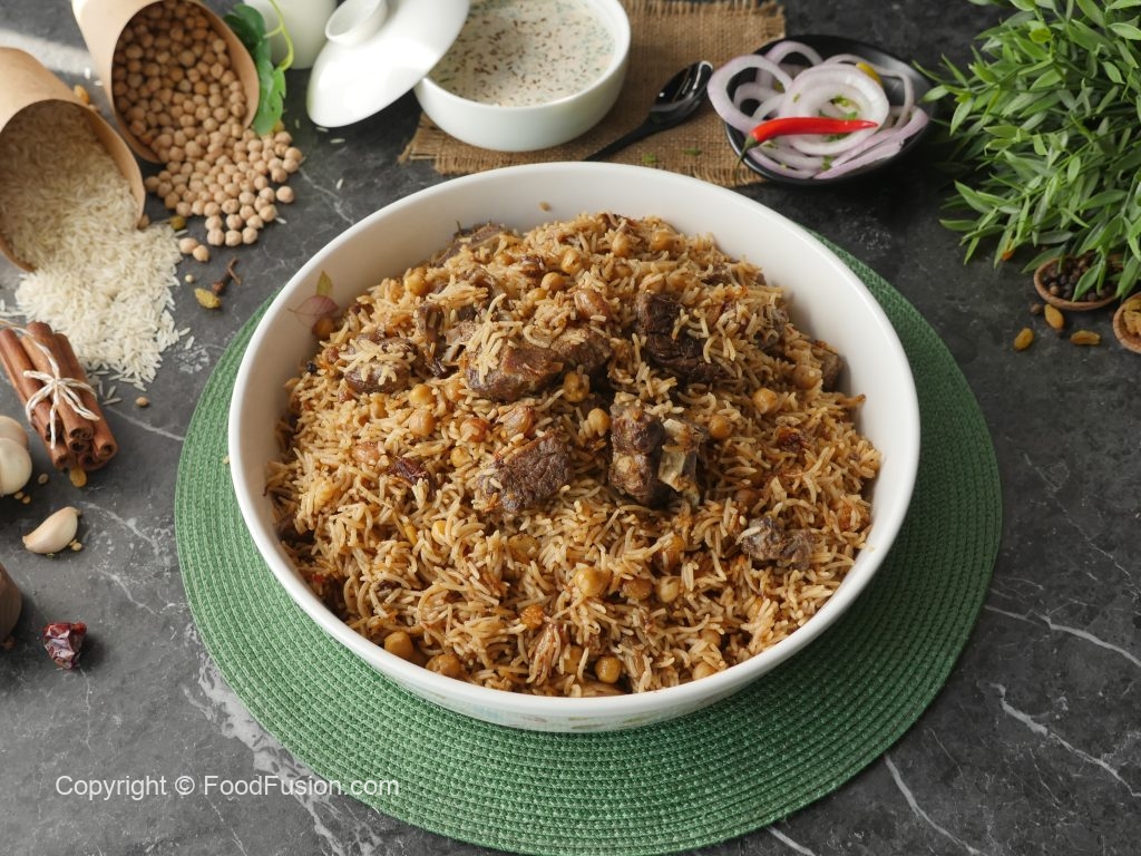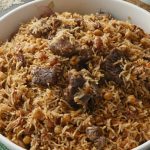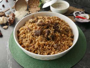 -Now add cooked meat,sprinkle reserved ground spices (1 tsp),cover with kitchen cloth & lid and cook on high flame for 2 minutes to build up steam then steam cook on low flame for 8-10 minutes.
