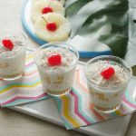 Sprinkle fresh coconut and top with cherry.