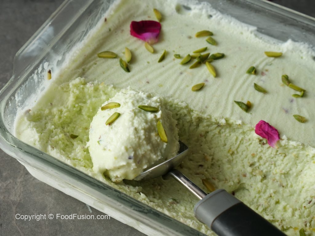 Once frozen completely,scoop out,decorate with pistachios & serve!