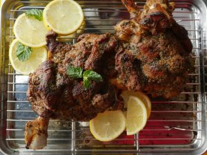 On baking tray,place cooked mutton leg and with the help of the brush,apply prepared mint mixture.