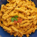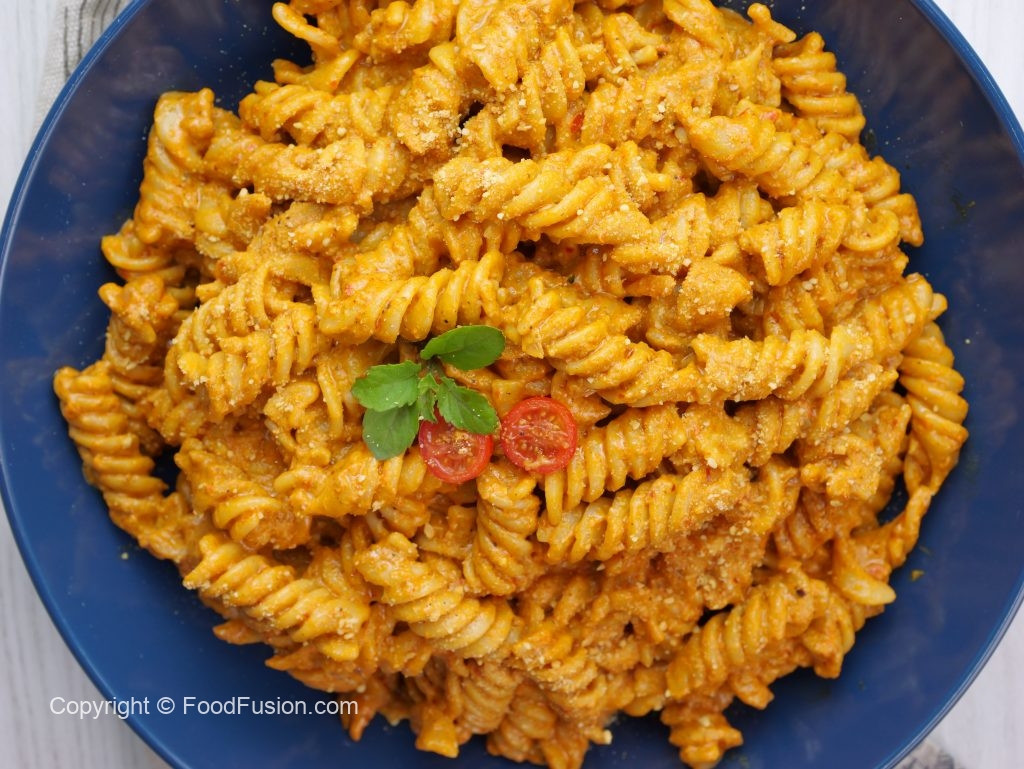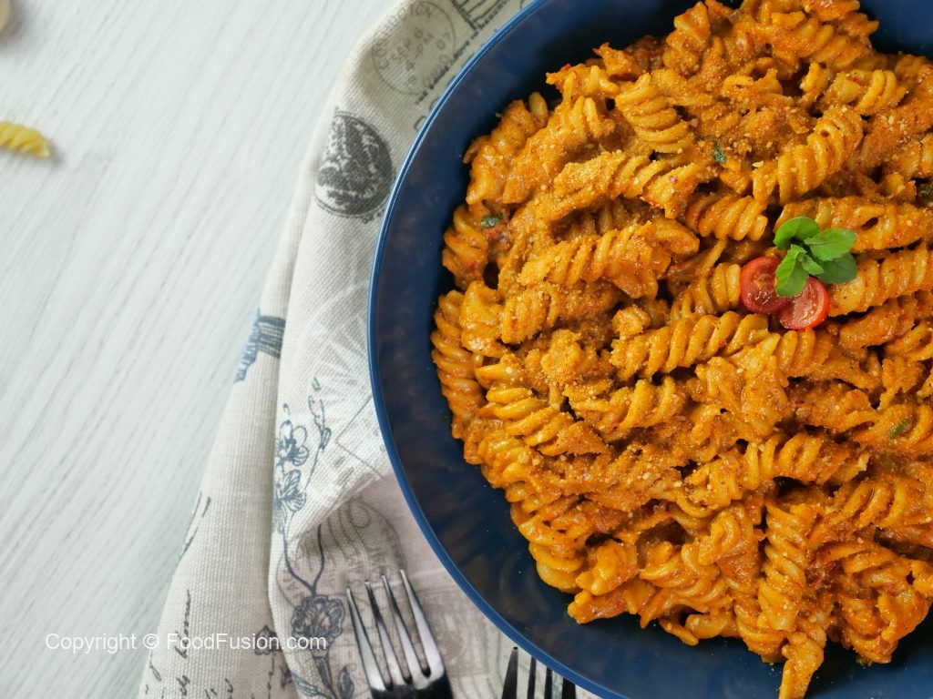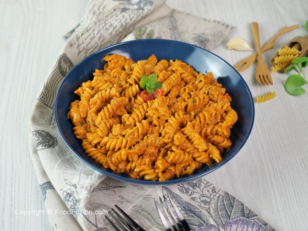 -Blender mein sun-dried tomatoes,kashmiri lal mirch,badam,roasted shimla mirch & lehsan,fresh basil leaves,pink salt,kali mirch powder,parmesan cheese powder aur olive oil dla ker ache tarhan blend ker lein & side per rakh dein.