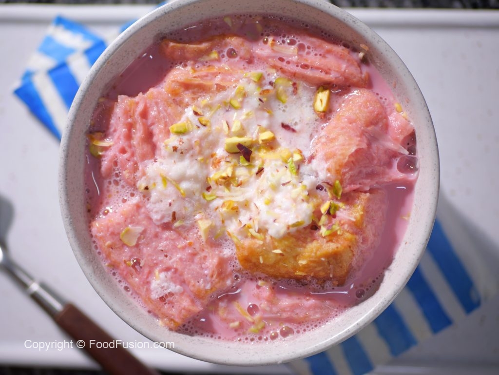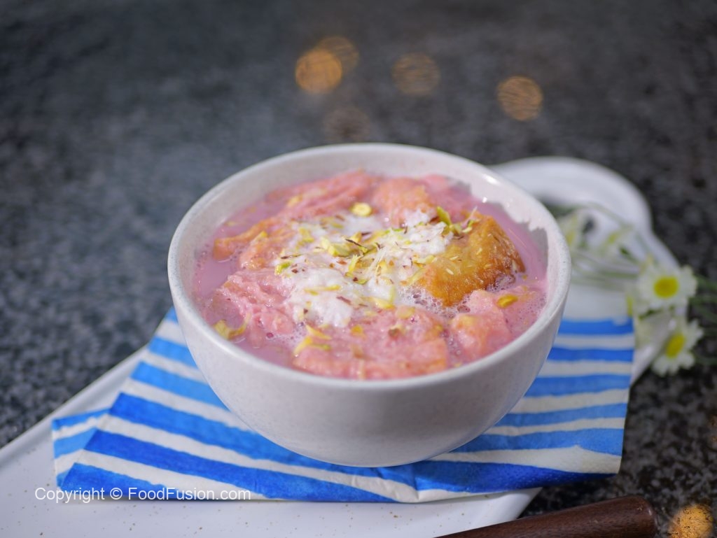 In a traditional serving bowl, add puff biscuits, fresh cream, prepared Kashmiri tea and garnish it with almonds and pistachios.