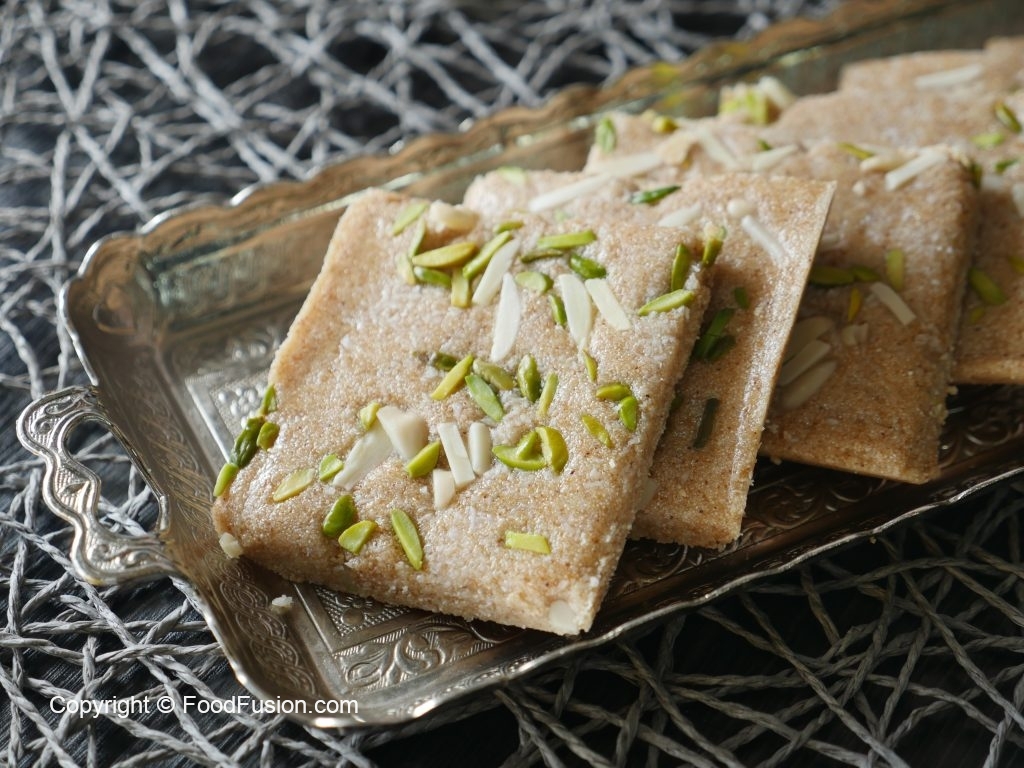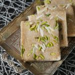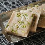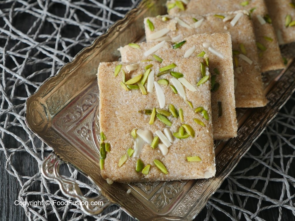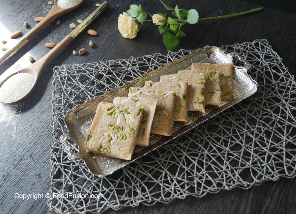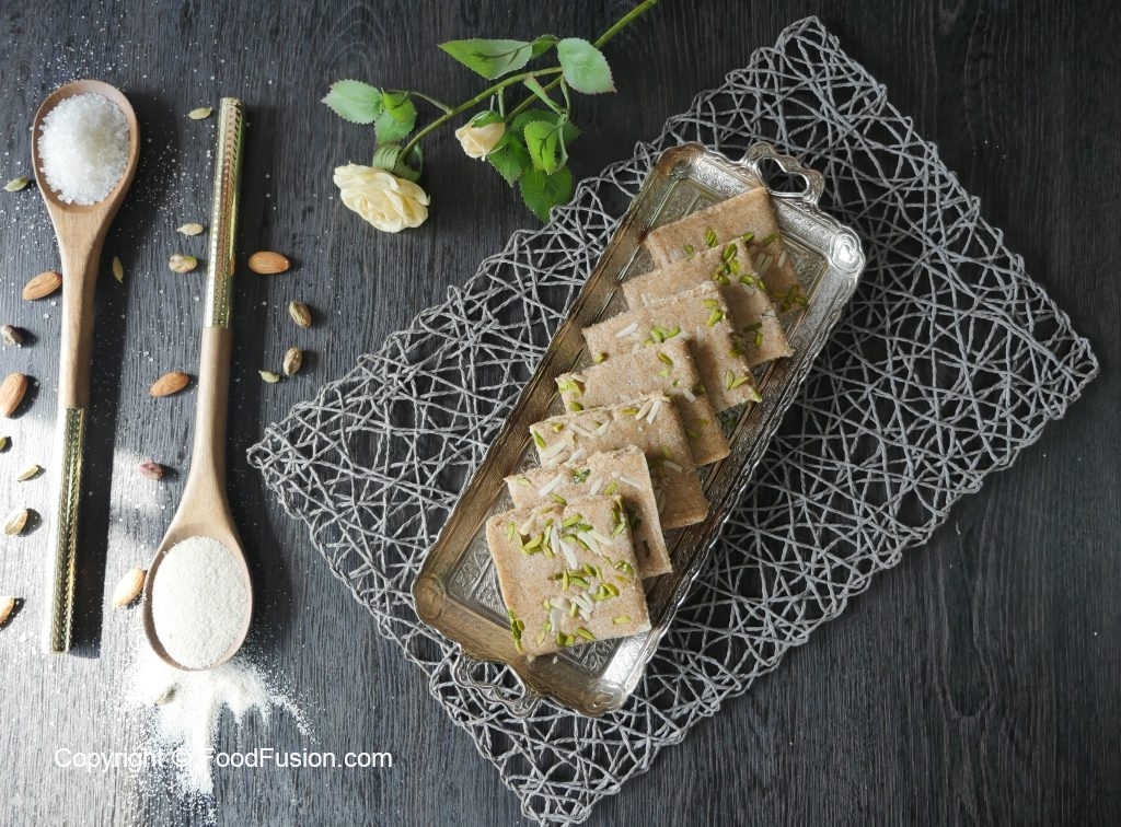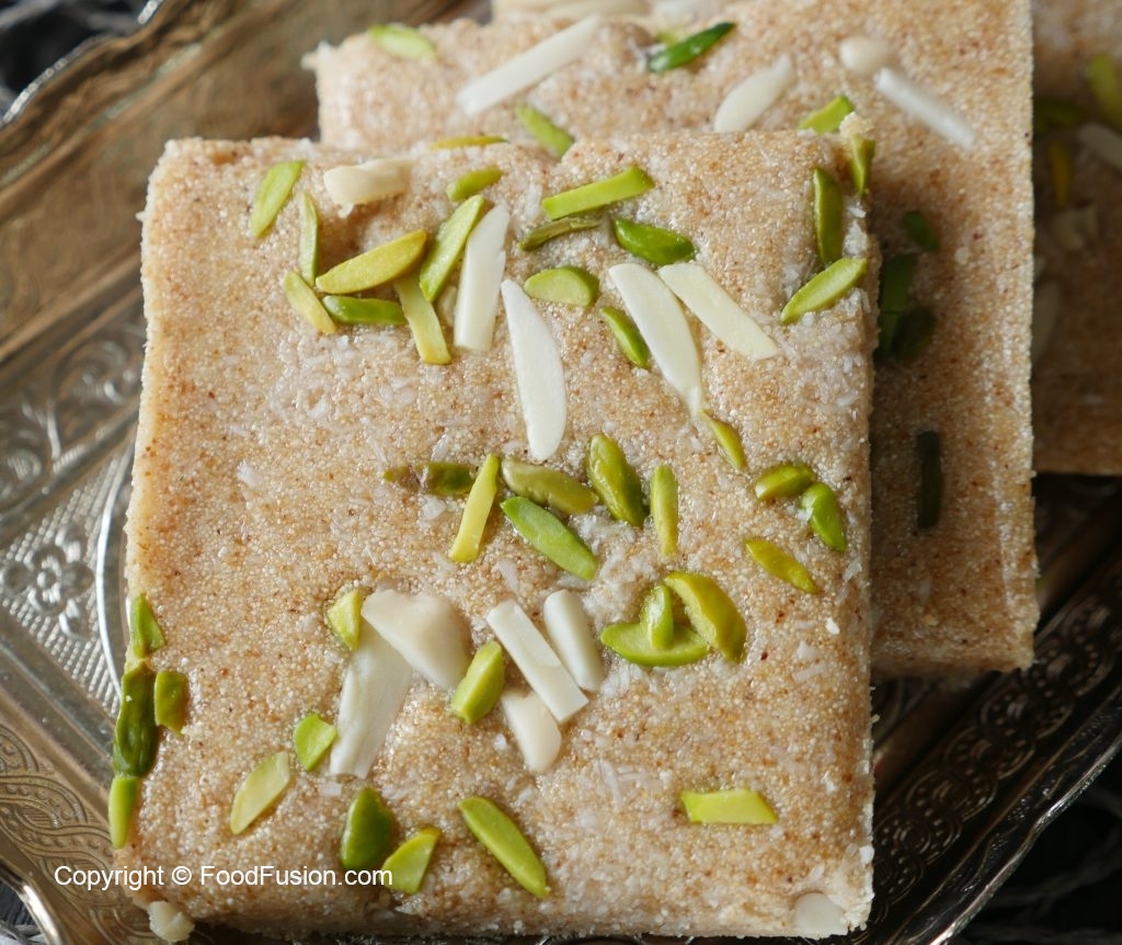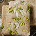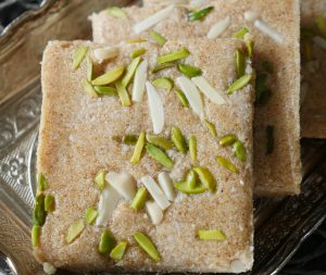 On greased tray 9 x 12“(with ghee),add prepared sooji mixture,desiccated coconut,almonds,pistachios & press firmly.