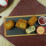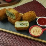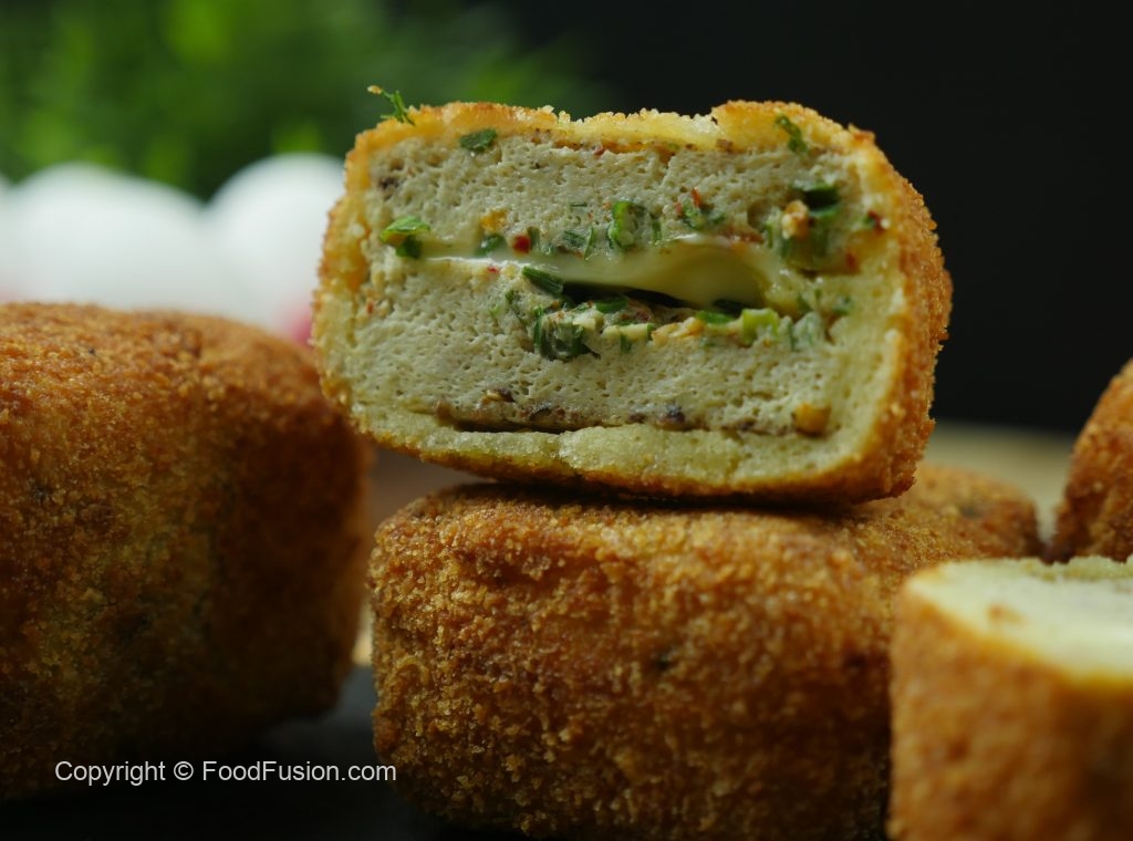 Now dip into beaten eggs and coat with breadcrumbs then again dip into beaten eggs and coat with breadcrumbs (makes 6).