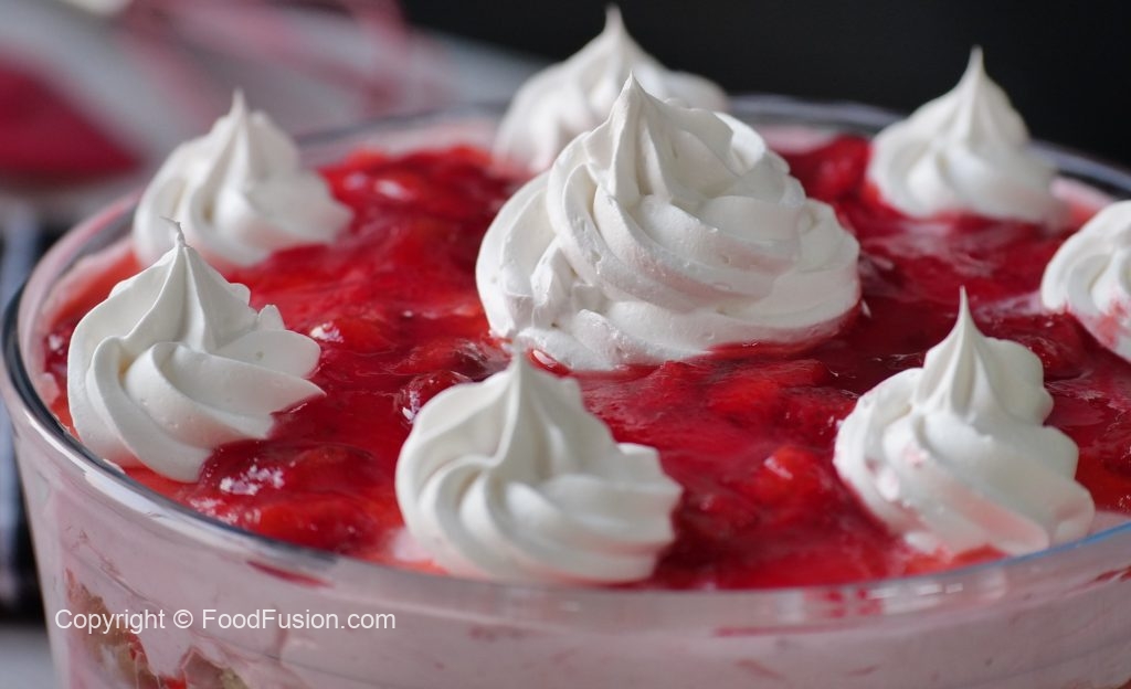 In a serving gar,add prepared strawberry jello,crumbled plain sponge cake,prepared strawberry cream, prepared strawberry jello,crumbled angel food cake or plain sponge cake,prepared strawberry cream & garnish with reserved whipped cream & strawberry jello.