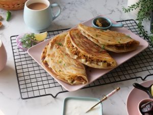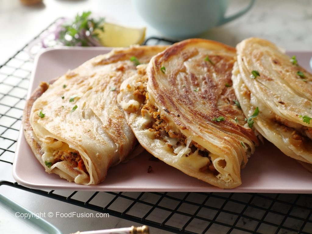 -Spread prepared chicken filling on one side, add mozzarella cheese & flip the other side of paratha over it. Press gently & cook from both sides until golden & crispy (makes 10).