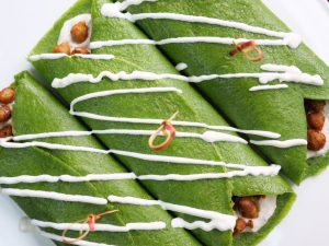 -Crepe per tayyar dahi sauce & tayyar spiced (masala) chickpea dal ker crepe ko fold ker lein.