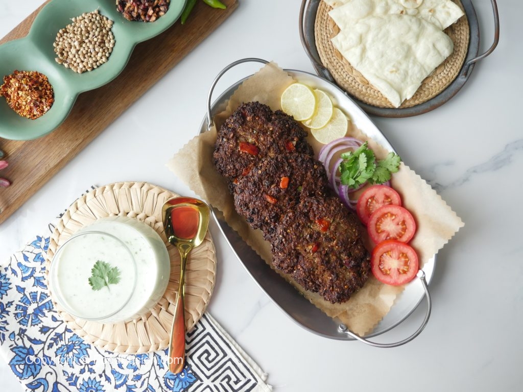 In bowl,add beef mince,grated & squeeze onion,green chilli,ginger garlic paste,fresh coriander,dried pomegranate seeds,coriander seeds,red chili crushed,cumin powder,salt,garam masala powder,carom seeds,black pepper powder and mix until well combined.