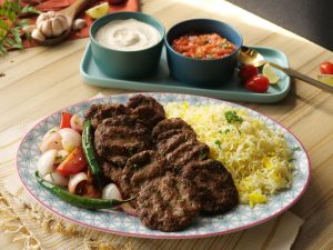 -Kofta kebab ko saffron butter rice,grilled vegetables & tahini yogurt sauce ka saath serve karein.