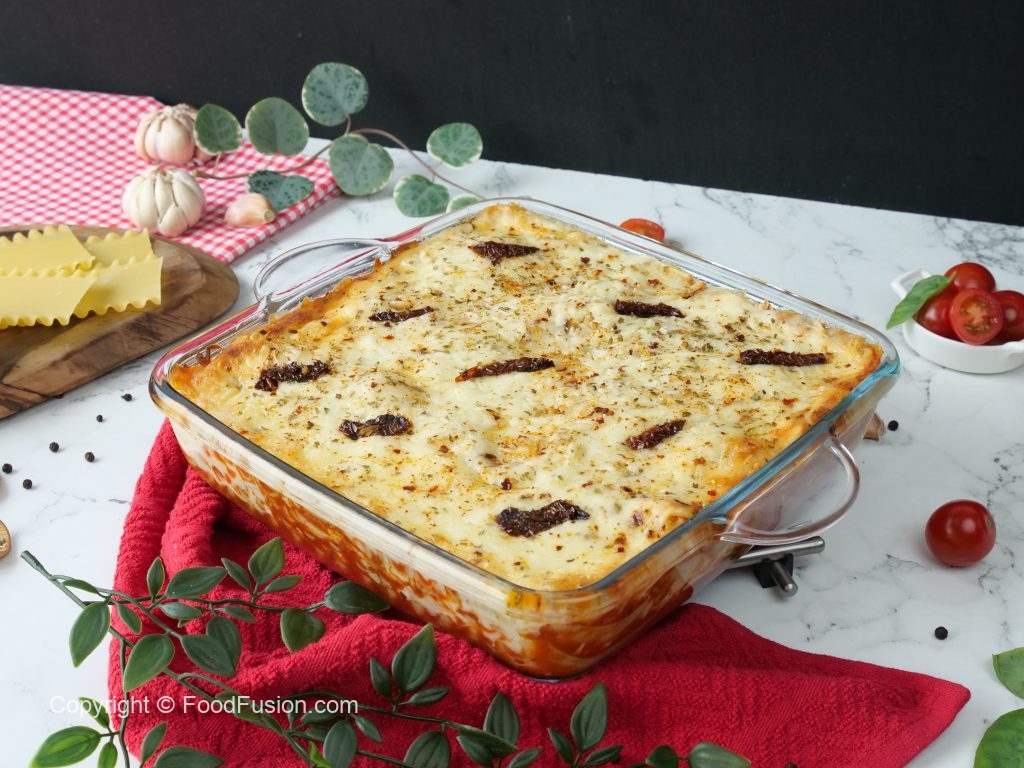 -In baking dish,add & spread pizza sauce,place lasagna sheets,pizza sauce,prepared tuscan chicken sauce,cheddar,cheese,mozzarella cheese,lasagna sheets,pizza sauce,prepared tuscan chicken sauce, cheddar cheese,mozzarella cheese,lasagna sheets,pizza sauce,prepared tuscan chicken sauce, cheddar cheese,mozzarella cheese,dried oregano,red chilli crushed & sundried tomatoes.