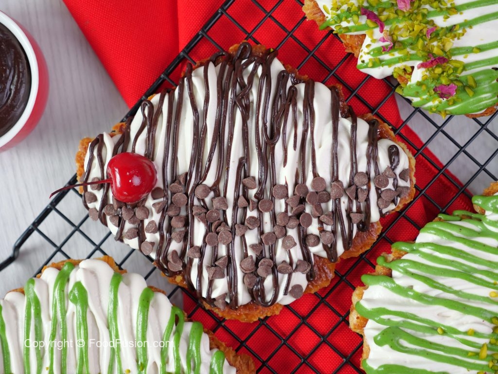 -On a caramelized croissant,add & spread cream frosting,chocolate ganache,chocolate chips & garnish with cherry.